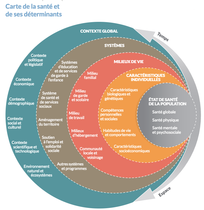 > L’Organisation mondiale de la santé définit la santé comme « un état de complet bien-être physique, mental et social, et ne consiste pas en une absence de maladie ou d’infirmité ». Un état tributaire de nombreux facteurs identifiés comme des « déterminants de santé » et classifiés selon des catégories spécifiques (voir la « carte de la santé et ses déterminants » ci-dessous.